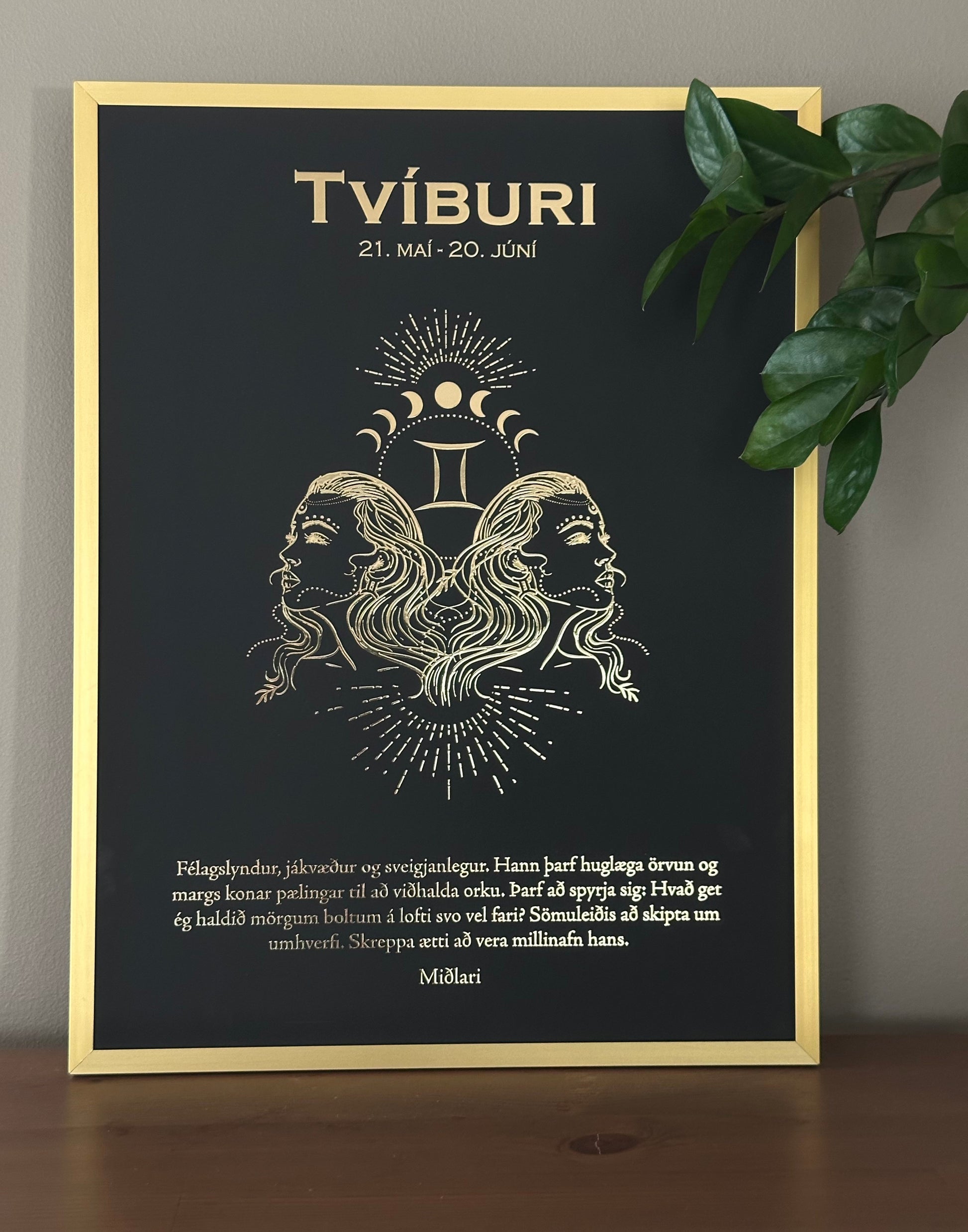 Hægt er að velja á milli smærri eða stærri myndar, með eða án ramma. Við mælum sérstaklega með gullramma, þar sem við prófuðum fjölmarga liti og útfærslur áður en við fundum hina fullkomnu samsetningu. Niðurstaðan var þessi glæsilegi gullrammi, sem eykur bæði dýpt og kraft myndarinnar og undirstrikar glæsileika hennar.